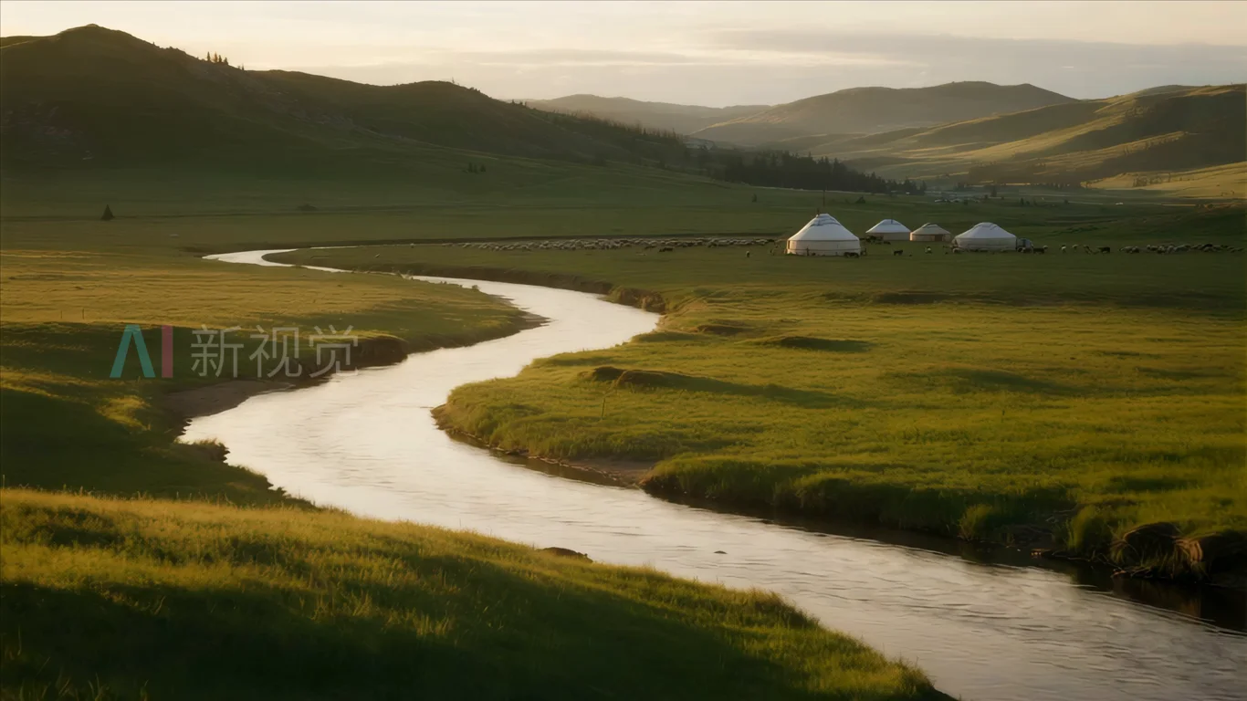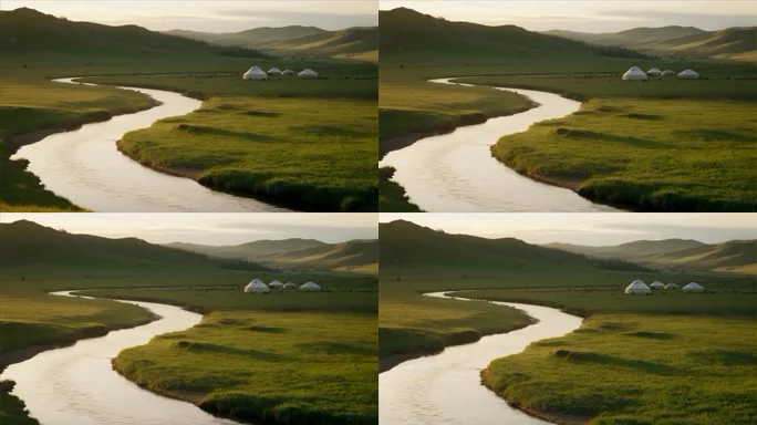 草原河流与蒙古包风景