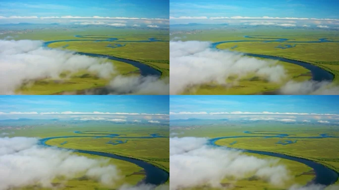 草原河流云雾鸟瞰全景