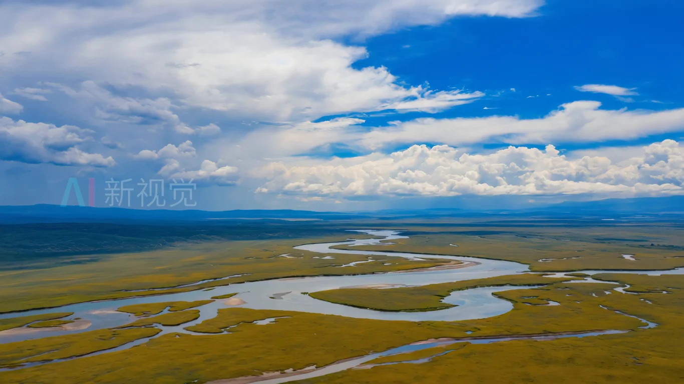 草原河流空中俯瞰全景