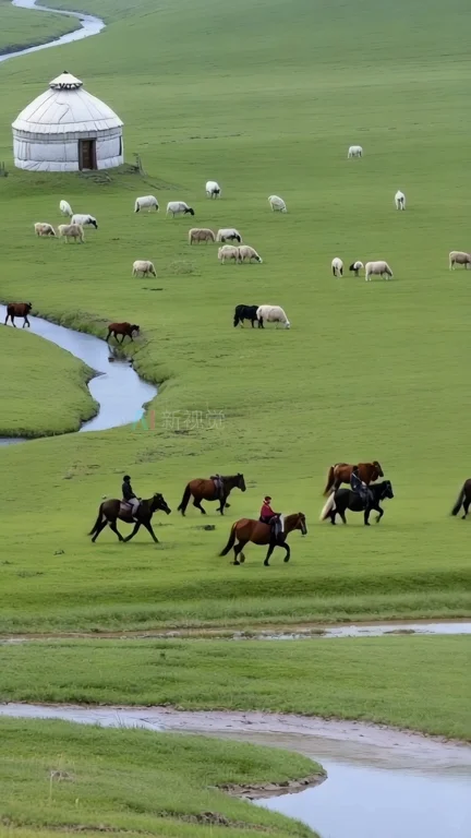 草原牧民骑马放牧景象