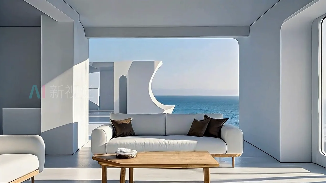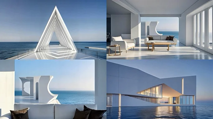 4K,3840*2160,30P,MP4格式 原创4K素材,放心商用。 AIGC-可收徒 高端房地产艺术创意三维建筑空间极简意境光影大海日出抽象宣传片素材